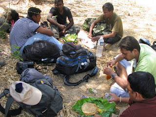 To add to all this, suddenly someone had a feeling that we missed the turn leading to Kodakerai! We enquired with few villagers on the way and were quite relieved to find that we were on the right track! President located the mud-track opposite to the hand-pump on the road and we happily took the deviation. This path was little more interesting than the tar road given the winding roads inside the forest and the beaming sense of adventure within us. By this time the breeze had picked up and helped us walk a little faster towards our destination. At this point we decided to take a lunch break. Not that we were all extremely hungry but this atleast would make our bags lighter and would translate into walking faster.